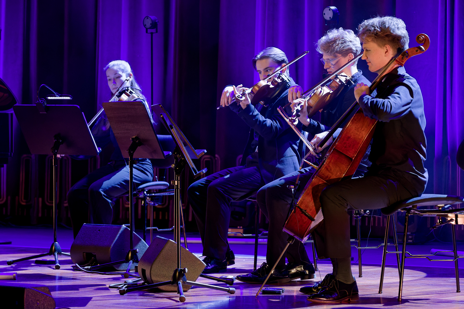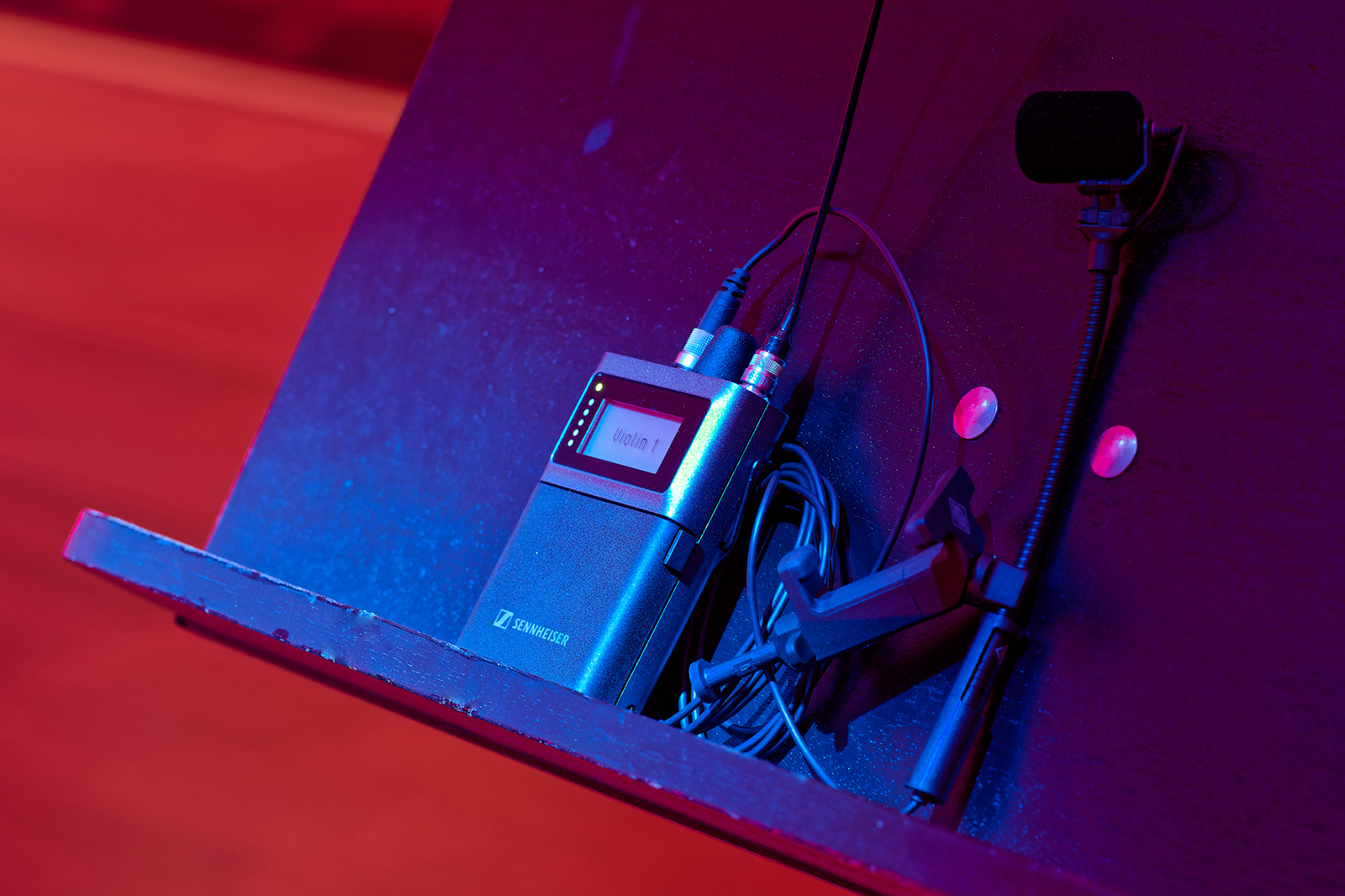Звучання першої й другої скрипок та альта оркестру передають мікрофони Neumann MCM 114 у версії Set High Strings (з тримачами MC 1), а звучання віолончелі - Neumann MCM 114 у версії Set Cello (з тримачем MC 2). На думку Торстена Зелігера, така система нових інструментальних мікрофонів Neumann дає змогу повною мірою реалізувати усі основні переваги електретної схеми та досягнути найвищого рівня якості звуку з неймовірно реалістичним відтворенням басового та тенорового діапазонів, а також із максимально чистими й прозорими високими частотами.