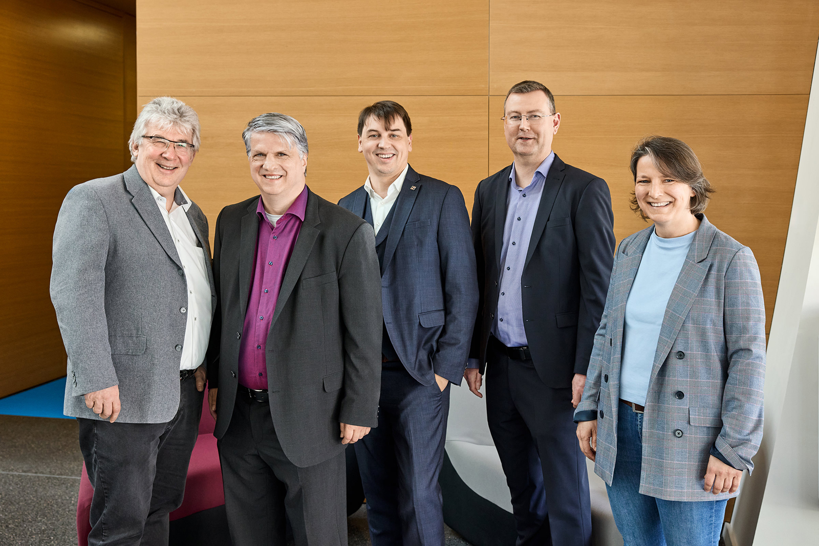 Учасники заключного семінару проєкту MERCI (зліва направо): д-р Вальтер Маттаух з Федерального міністерства економіки та захисту клімату, д-р Андреас Вільчек, генеральний керівник консорціуму та керівник колективу німецьких фахівців MERCI, Єнс Пільц, проєкт-менеджер MERCI, Жан Ауттерс, керівник колективу французьких фахівців MERCI, та д-р Анне Пелег-Рисаві, представник з німецької проєктної агенції DLR-PT