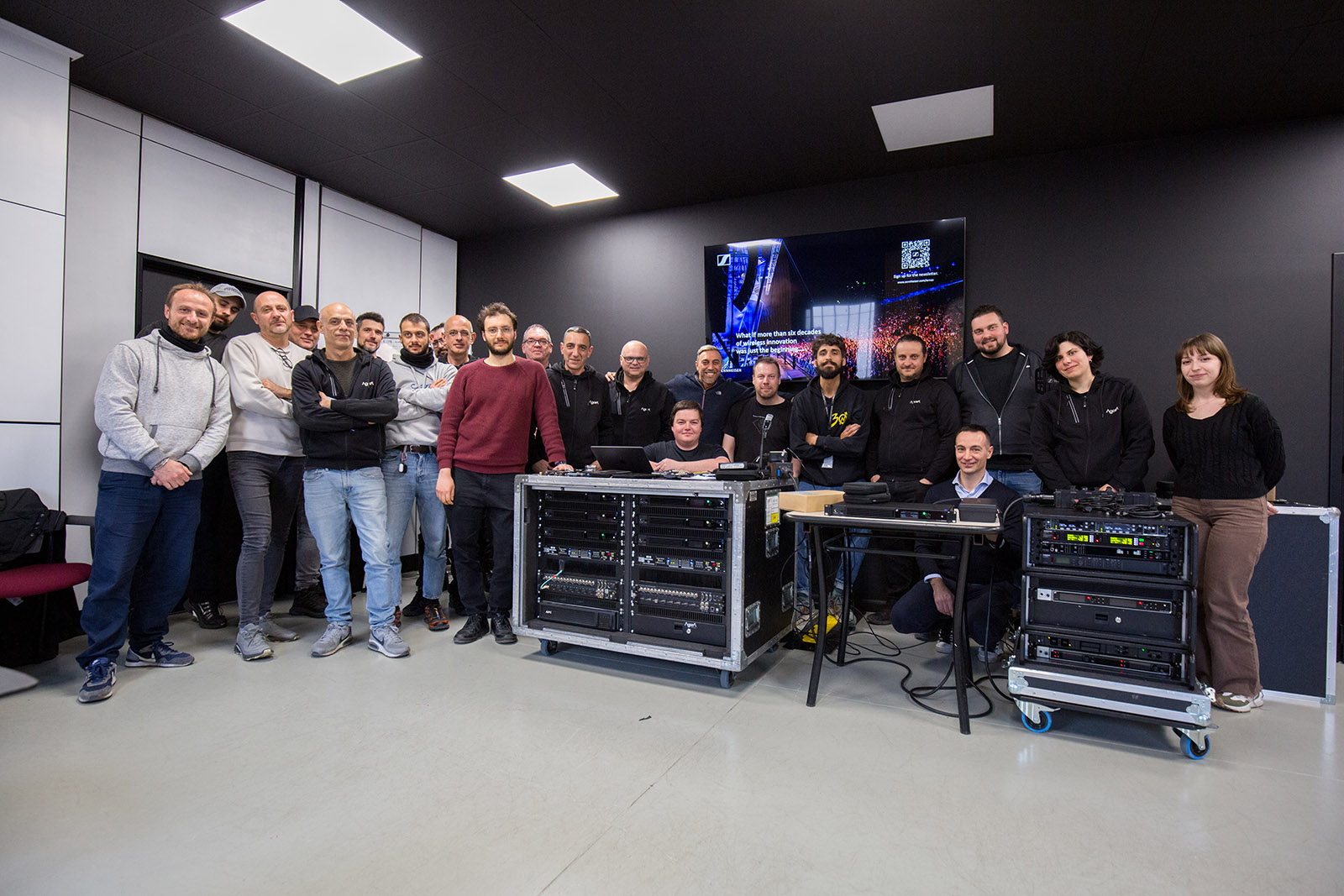 Робоча зустріч у Ведемарку (зліва направо): Корінна Троян (директорка з продажу у регіоні EMEA), Себастьян Георгі (старший інженер-розробник відділу технологій передачі даних), генеральний директор компанії доктор Андреас Зеннхайзер, Доменіко Черкуа (керівник відділу систем аудіо освітлення в Agora), Жером Застров (старший менеджер з цифрового моделювання), Йонас Несбі (інженер з технічних програм), Фабіо Фумагаллі (представник Exhibo, компанії-партнера Sennheiser), Валеріо Мотта (керівник проєкту Eurovision Song Contes в Agora), Ян Ватерманн (старший системний архітектор), Кевін Юнг (архітектор системних рішень), Фолькер Шмітт (керівник відділу технічного інжинірингу)