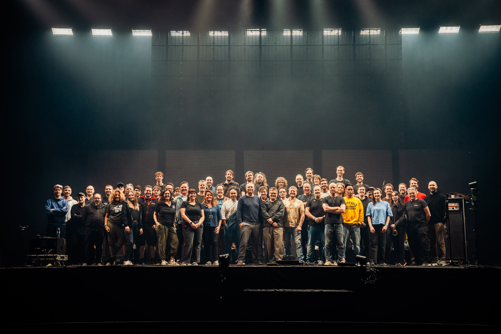 Моніторний звукорежисер Єлмер Дейкстра (зліва), інженер відділу техпідтримки Sennheiser Вінсент Тільгенкамп (в центрі) та FoH-звукорежисер гурту Марті Брюгманс (справа)