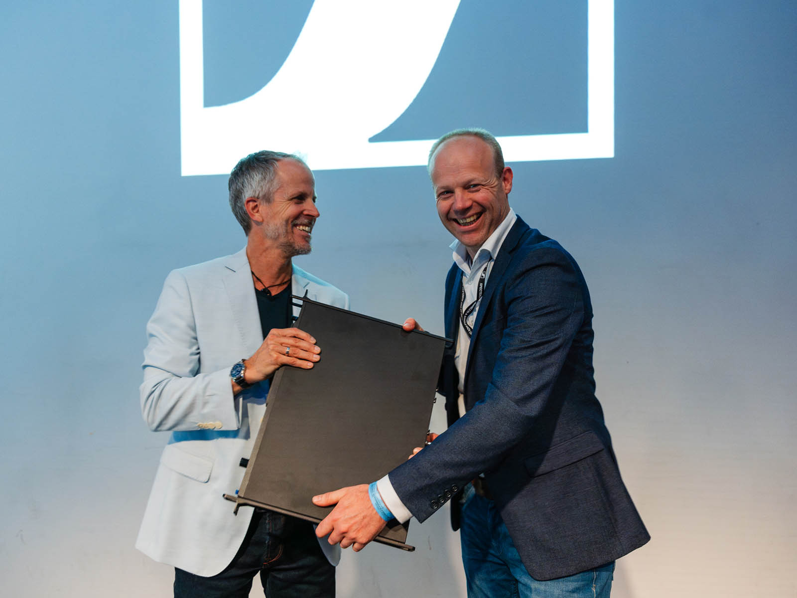 Генеральний директор компанії Flowsound Флоріс ван ден Берг (справа) та генеральний співдиректор Sennheiser Group Андреас Зеннхайзер під час офіційної презентації екосистеми Spectera на міжнародній виставці IBC-2024