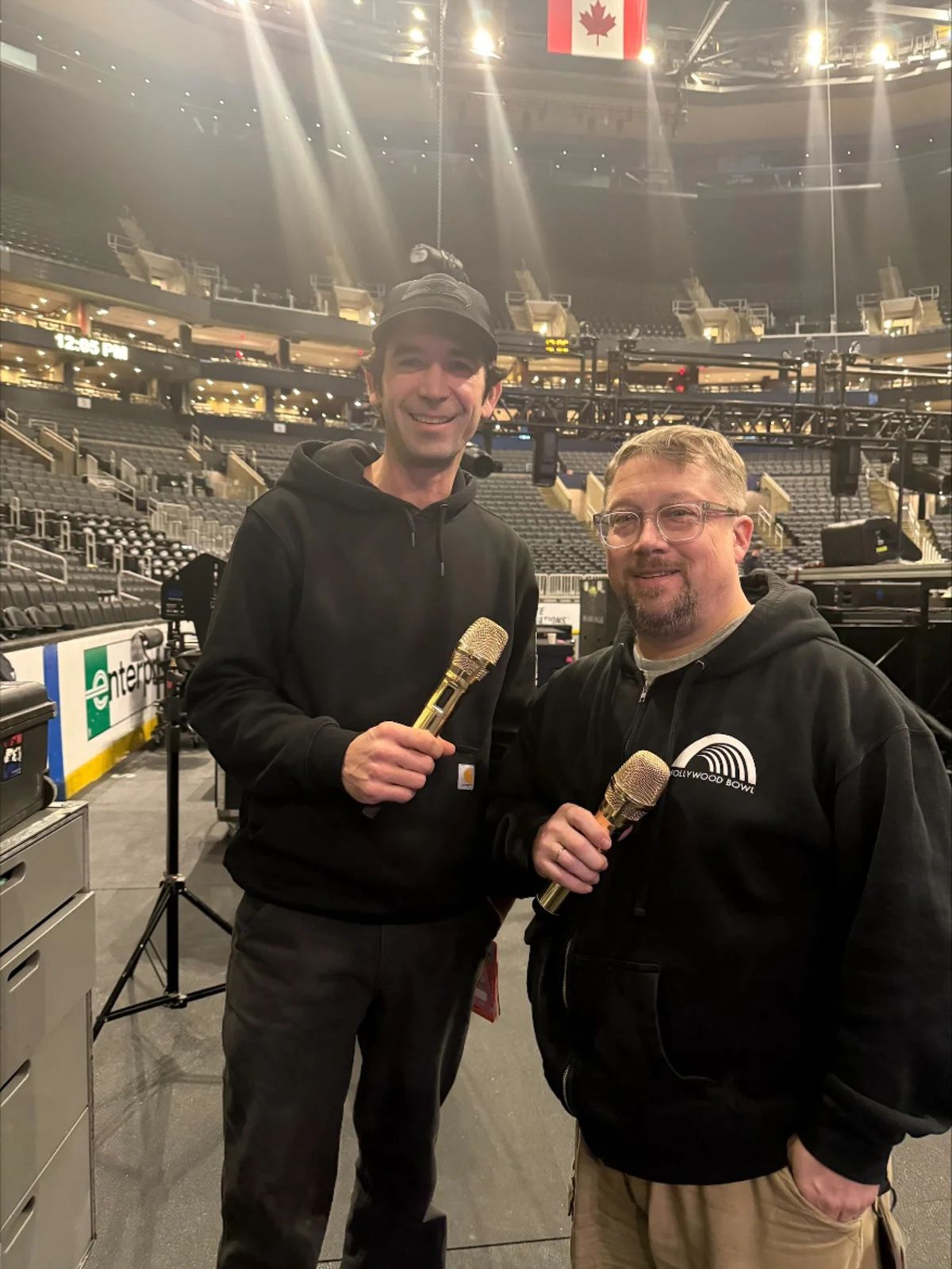 Звукорежисери Бренді Карлайл: моніторний Джеррі Стрітер (ліворуч) та FoH Шон Квакенбуш (праворуч) з робочими прототипами ручних бездротових модулів Spectera у кастомному, "золотому" оздобленні