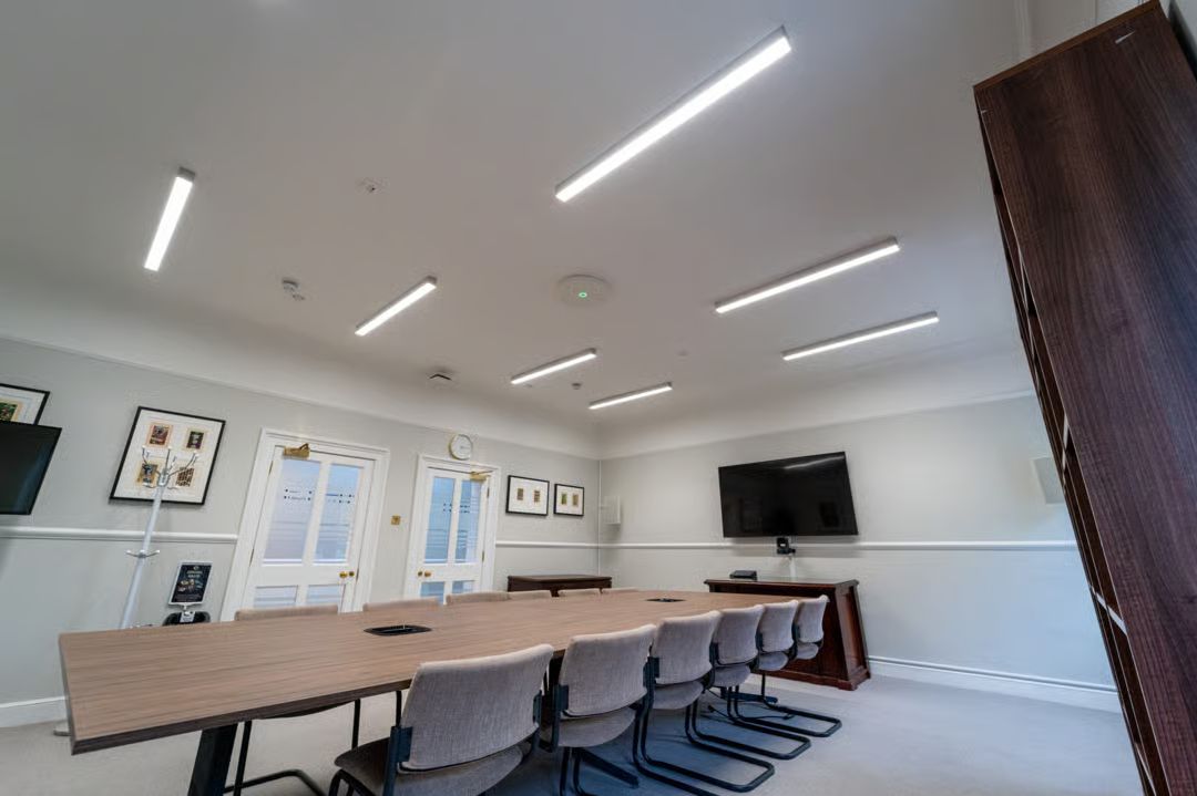 Приміщення для засідань на верхніх поверхах, зокрема кімната імені Хелен Ланган, оснащені більш компактними стельовими конференц-системами TeamConnect Ceiling Medium (TCC M), сенсорними панелями Logitech Tap та цифровими бездротовими мікрофонами SpeechLine Digital Wireless. Таке рішення краще підходить для кімнат середньої та малої площі й дає змогу максимально комфортно працювати та спілкуватися невеликим колективам користувачів. Технології Sennheiser, передусім системи динамічного спрямування мікрофонів у комплексі з TruVoicelift, дають змогу при цьому всім учасникам робочого процесу розмовляти без зайвого напруження й абсолютно вільно рухатися приміщенням, що раніше, коли в кімнатах були встановлені старі мікрофони, було технічно неможливим.
