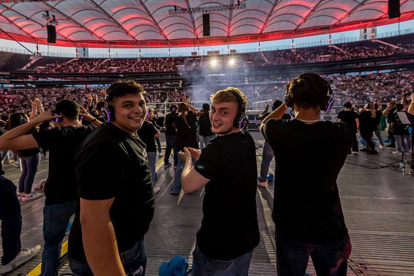 Сигнали систем персонального моніторингу, включно з анонсами та клік-треками, вокалісти та інструменталісти на свої навушники отримували у режимі "тихої дискотеки". А тексти пісень та ноти під час виступів транслювали світлодіодні табло між ярусами головної трибуни стадіону. Звичайно ж, найважливішим у цій системі було забезпечити ідеальну синхронізацію відеоконтенту з сигналами систем моніторингу.